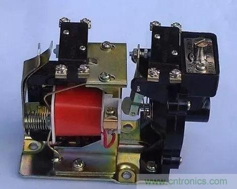 其中通電延時(shí)型時(shí)間繼電器動(dòng)作過程是:線圈不通電時(shí),線圈的銜鐵釋放壓住動(dòng)作杠桿,延時(shí)和瞬時(shí)觸點(diǎn)不動(dòng)作;當(dāng)線圈得電吸合后,銜鐵被吸合,銜鐵上的壓板首先將瞬時(shí)觸點(diǎn)按下,觸點(diǎn)動(dòng)作發(fā)出瞬時(shí)信號。這是因?yàn)殂曡F吸合動(dòng)作杠桿不受壓力,在助力彈簧作用下慢慢動(dòng)作(也就是延時(shí)),動(dòng)作到達(dá)最大位置杠桿上的壓板按動(dòng)延時(shí)觸點(diǎn),觸點(diǎn)動(dòng)作發(fā)出延時(shí)信號,直至線圈無電釋放,動(dòng)作結(jié)束。其實(shí)物圖片如下圖: