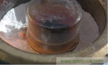 首先把要拆解的芯片放置在裝了濃硫酸的容器里,容器需要蓋住,但不能嚴實,這樣里面的氣體才能漫溢出來。把容器里的濃硫酸加熱到沸騰(大約 300 攝氏度),在瓶底的周圍鋪上蘇打粉——用來預防意外飛濺出來的硫酸液和冒出來的硫酸氣體。