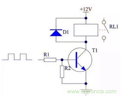 當(dāng)晶體管用來(lái)驅(qū)動(dòng)繼電器時(shí),必須將晶體管的發(fā)射極接地。具體電路如下:
