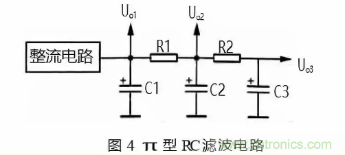 由于這種濾波電路的形式如同希臘字母 π 和采用了電阻器、電容器,所以稱(chēng)為 π 型 RC 濾波電路。
