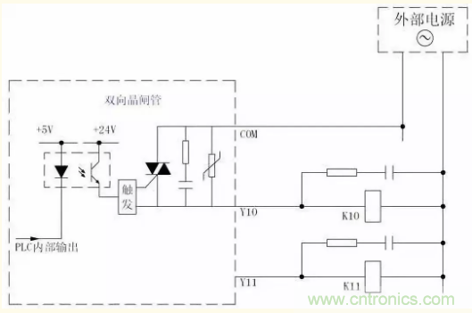 雙向晶閘管輸出的驅(qū)動能力要比繼電器輸出的要小,允許負(fù)載電壓一般為AC85~242V;單點(diǎn)輸出電流為0.2A~0.5A,當(dāng)多點(diǎn)共用公共端時,每點(diǎn)的輸出電流應(yīng)減小(如單點(diǎn)驅(qū)動能力為0.3A的雙向晶閘管輸出,在4點(diǎn)共用公共端時,最大允許輸出為0.8A/4點(diǎn))。