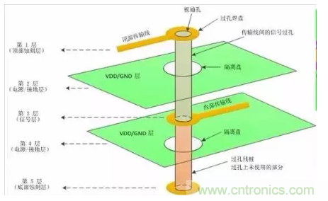 過孔是鍍?cè)陔娐钒屙攲优c底層之間的通孔外的金屬圓柱體。信號(hào)過孔連接不同層上的傳輸線。過孔殘樁是過孔上未使用的部分。過孔焊盤是圓環(huán)狀墊片,它們將過孔連接至頂部或內(nèi)部傳輸線。隔離盤是每個(gè)電源或接地層內(nèi)的環(huán)形空隙,以防止到電源和接地層的短路。