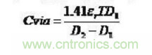 從等效電路模型可知,過孔本身存在對(duì)地的寄生電容,假設(shè)過孔反焊盤直徑為D2,過孔焊盤的直徑為D1,PCB板的厚度為T,板基材介電常數(shù)為ε,則過孔的寄生電容大小近似于: