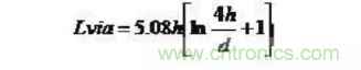 它的寄生串聯(lián)電感會(huì)削弱旁路電容的貢獻(xiàn),從而減弱整個(gè)電源系統(tǒng)的濾波效用。假設(shè)L為過孔的電感,h為過孔的長度,d為中心鉆孔的直徑。過孔近似的寄生電感大小近似于:
