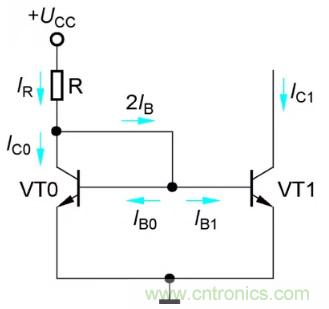 如圖1所示為鏡像恒流源電路,它由兩只特性完全相同的管子VT0和VT1構(gòu)成,由于VT0管的c、b極連接,因此UCE0=UBE0,即VT0處于放大狀態(tài),集電極電流IC0=β0*IB0。另外,管子VT0和VT1的b-e分別連接,所以它們的基極電流IB0=IB1=IB。設(shè)電流放大系數(shù)β0=β1=β,則兩管集電極電流IC0=IC1=IC=β*IB。可見,由于電路的這種特殊接法,使兩管集電極IC1和IC0呈鏡像關(guān)系,故稱此電路為鏡像恒流源(IR為基準電流,IC1為輸出電流)。