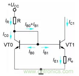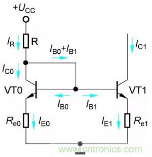 與典型的靜態(tài)工作點穩(wěn)定電路一樣,Re0和Re1是電流負反饋電阻,因此與鏡像恒流源電路相比,比例恒流源的輸出電流IC1具有更高的穩(wěn)定性。