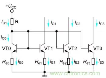 圖4所示電路是在比例恒流源基礎(chǔ)上得到的多路恒流源電路,IR為基準電流,IC1、IC2和IC3為三路輸出電流。由于各管的b-e間電壓UBE數(shù)值大致相等,因此可得近似關(guān)系