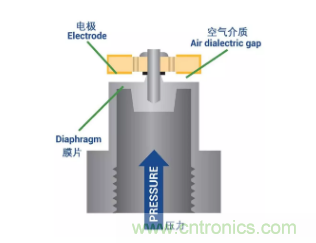 簡單地說,這些壓力傳感器是一種電容器,一種具有充電能力的裝置。當(dāng)壓力作用到傳感器內(nèi)部的膜片上時,膜片就會收縮,或向固定電極彎曲,并改變電容。這種物理變化會導(dǎo)致電子輸出的變化,該裝置可將壓力讀數(shù)轉(zhuǎn)換成電流或電壓值。