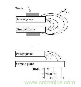 “20H規(guī)則”的采用是指要確保電源平面的邊緣要比0V平面邊緣至少縮入相當(dāng)于兩個(gè)平面間層距的20倍。