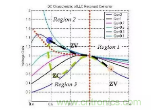 LLC諧振轉(zhuǎn)換器的工作范圍受限于峰值增益。值得注意的是,峰值電壓增益既不發(fā)生在fr1處 ,也不出現(xiàn)在 fr2處。峰值增益對(duì)應(yīng)的峰值增益頻率是fr2與fr1之間的最大頻率。隨著Q值減?。S著負(fù)載減?。?,峰值增益頻率移向fr2,并且獲得更高的峰值增益。隨著Q值增加(負(fù)載增加),峰值增益頻率移向fr1,峰值增益下降。因此,滿載應(yīng)該是諧振網(wǎng)絡(luò)設(shè)計(jì)的最差工作條件。