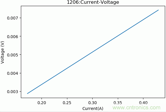 下面分別測試了0603, 0805, 1206三種封裝下,通過的電流和電阻兩端之間的電壓的關(guān)系。可以看到三種封裝的電阻都在電流實(shí)際超過6A之后,電壓開始快速上升。