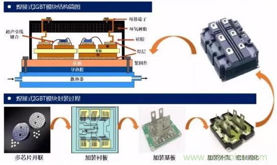 IGBT模塊按封裝工藝來(lái)看主要可分為焊接式與壓接式兩類(lèi)。高壓IGBT模塊一般以標(biāo)準(zhǔn)焊接式封裝為主,中低壓IGBT模塊則出現(xiàn)了很多新技術(shù),如燒結(jié)取代焊接,壓力接觸取代引線鍵合的壓接式封裝工藝。