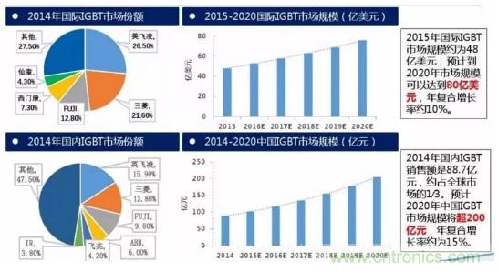 2015年國(guó)際IGBT市場(chǎng)規(guī)模約為48億美元,預(yù)計(jì)到2020年市場(chǎng)規(guī)模可以達(dá)到80億美元,年復(fù)合增長(zhǎng)率約10%。2014年國(guó)內(nèi)IGBT銷(xiāo)售額是88.7億元,約占全球市場(chǎng)的1∕3。預(yù)計(jì)2020年中國(guó)IGBT市場(chǎng)規(guī)模將超200億元,年復(fù)合增長(zhǎng)率約為15%。