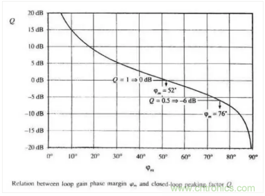 所以環(huán)路要留一定的相位裕量,如圖Q=1時輸出是表現(xiàn)最好的,所以相位裕量的最佳值為52度左右,工程上一般取45度以上.如下圖所示: