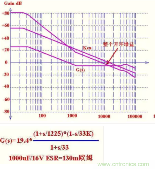 三個點的選取,第一個極點在原點,第一的零點一般取在帶寬的1/5左右,這樣在帶寬處提升相位78度左右,此零點越低,相位提升越明顯,但太低了就降低了低頻增益,使輸出調(diào)整率降低,此處我們?nèi)?.6K.第二個極點的選取一般是用來抵消ESR零點或RHZ零點引起的增益升高,保證增益裕度.我們用它來抵消ESR零點,使帶寬處保持-20db/10decade的形狀,我們?nèi)SR零點頻率5.3K