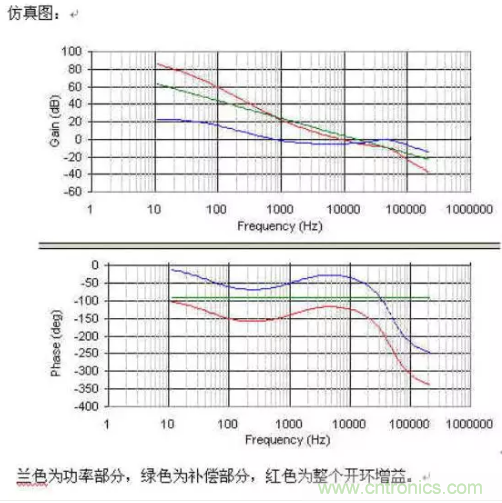 蘭色為功率部分,綠色為補償部分,紅色為整個開環(huán)增益.
