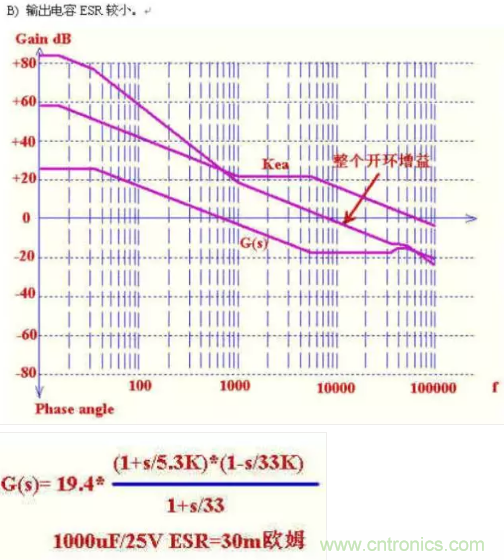 輸出濾波電容的內(nèi)阻比較大,自身阻容形成的零點比較高,這樣在8K處的相位滯后比較大.
