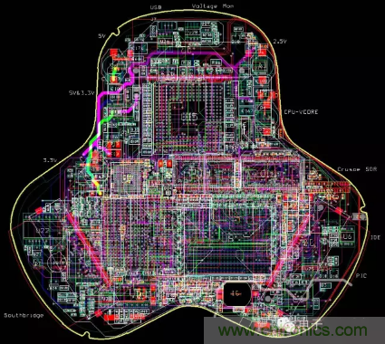 圖4 這片掌上電腦的12層電路板原型看起來(lái)很厲害,但是因?yàn)樽詣?dòng)布線(xiàn)器搞砸了PCI總線(xiàn)的時(shí)序,根本無(wú)法運(yùn)作。
