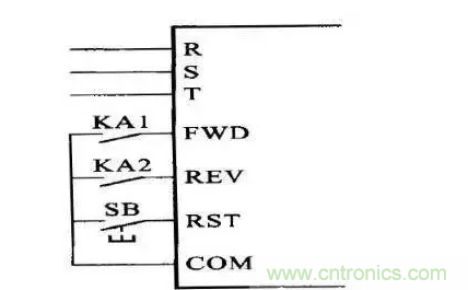 3、找到變頻器的控制端子,在外面加裝2個(gè)中間繼電器,分別是KA1與KA2,接線方法如下圖所示,KA1工作時(shí),變頻器正轉(zhuǎn),KA2工作時(shí),變頻器反轉(zhuǎn),SB是復(fù)位按鈕,當(dāng)有異常報(bào)警時(shí),變頻器會(huì)停機(jī),此時(shí)按下RST,可以消除報(bào)警,然后再重新啟動(dòng)變頻器。