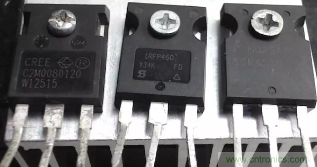 恰好手邊有如下功率MOS管,左邊為碳化硅MOS管,型號(hào)為C2M0080120,它的耐壓為1200V,導(dǎo)通電阻80m歐姆。
