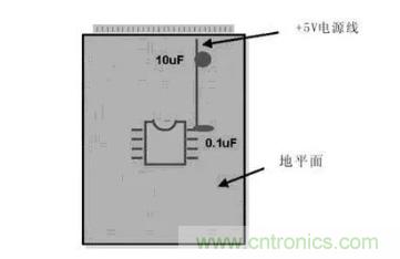 在布線時,模擬器件和數(shù)字器件都需要這些類型的電容,都需要靠近其電源引腳連接一個電容,此電容值通常為0.1uF。系統(tǒng)供電電源側(cè)需要另一類電容,通常此電容值大約為10uF。