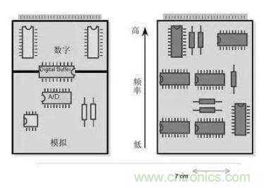 圖4 (左)將數(shù)字開關(guān)動作和模擬電路隔離,將電路的數(shù)字和模擬部分分開。(右)要盡可能將高頻和低頻分開,高頻元件要靠近電路板的接插件。
