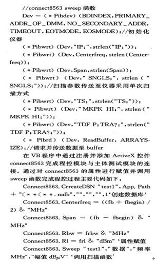 程控及系統(tǒng)自檢模塊均由VC++以控件形式實現(xiàn)。由于本系統(tǒng)使用的是NI公司的GPIB總線實現(xiàn)通信所以在VC++編程環(huán)境中,通過調(diào)用GPIB32.dll動態(tài)連接庫使用其內(nèi)部函數(shù)完成通信,儀器指令參照HP 8563EC編程指令編制主要代碼如下: