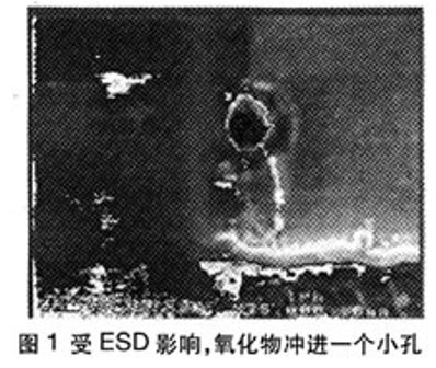 如圖1所示,電子部件受ESD影響時(shí),會發(fā)生什么?會產(chǎn)生一個(gè)細(xì)微的孔,氧化物將侵?jǐn)_部件。