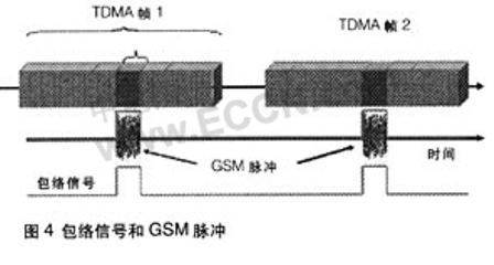 特定的手機(jī)只在屬于它的時(shí)間空當(dāng)發(fā)射。包絡(luò)信號的基本頻率是1/4.615 ms=217Hz。諧波頻率為434Hz、651Hz等。如此頻率是聽得到的。如圖4所示,為手機(jī)的包絡(luò)信號。