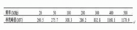 干擾源信號頻率越高,被干擾對象上的串擾幅值越大,我們對圖1中干擾源網(wǎng)絡(luò)AB上的信號頻率f1分別取不同頻率值時,對被干擾對象上的串擾進行了仿真,仿真結(jié)果見表2,信號頻率不同時的串擾波形見圖5,標記為“1”、“2”箭頭所指的波形頻率分別為“500MHz”、“100MHz”。