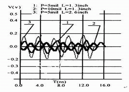 對于圖1所示的兩線系統(tǒng),我們進行了三種情況的仿真(線網(wǎng)AB上的信號頻率均為100MHz)仿真結(jié)果見表3,及圖6.:第一種情況是在兩線間距和平行長度不變的條件下,探測被干擾對象的串擾(標記“1”);第二種情況是在兩線平行長度不變的前提下,將兩線間距增加到10mils,然后探測被干擾對象的串擾標記“2”;第三種情況是在兩線間距不變的條件下,將兩線的平行長度增加到2.6inches標記“3”,然后探測被干擾對象的串擾。由仿真結(jié)果可見,當兩線的間距拉大時(P由5mils變?yōu)?0mils),串擾明顯地減小了,而當兩線的平行長度加長時(L由1.3inches變?yōu)?.6inches),串擾顯著增大了。