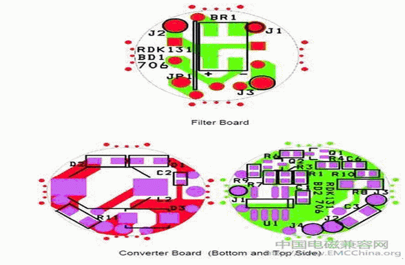 雖然該設計具有功能性,但仍存在傳導輻射問題。由于兩個PCB比較接近,開關電流會從轉換器電路板耦合到EMI濾波器電路板,從而降低EMI濾波器的性能。通過在這兩個電路板之間放置“屏蔽”PCB,這一問題便得以解決。而第三個電路板只是一層銅,并無電路。它被電氣連接到EMI濾波器負輸出端與轉換器負輸入端的接合處。這樣,總裝便由三個疊加在一起的圓形電路板組成。增加第三個電路板既簡單又節(jié)省成本,不但解決了耦合問題,還達到了EMI性能要求。
