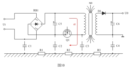 值得一提的是,開(kāi)關(guān)電源變壓器初級(jí)線圈的漏感產(chǎn)生的反電動(dòng)勢(shì)et,在所有干擾信號(hào)之中是最不容忽視的,如圖10所示。當(dāng)電源開(kāi)關(guān)管關(guān)斷的時(shí)候,開(kāi)關(guān)電源變壓器初級(jí)線圈的漏感產(chǎn)生的反電動(dòng)勢(shì)et幾乎沒(méi)有回路可釋放,一方面,它只能通過(guò)初級(jí)線圈的分布電容進(jìn)行充電,并讓初級(jí)線圈的分布電容與漏感產(chǎn)生并聯(lián)諧振;另一方面,它只能通過(guò)輻射向外進(jìn)行釋放,其中通過(guò)對(duì)地電容C3與大地相連,也是反電動(dòng)勢(shì)et釋放能量的一個(gè)回路,因此,它對(duì)輸入端也會(huì)產(chǎn)生共模信號(hào)干擾。