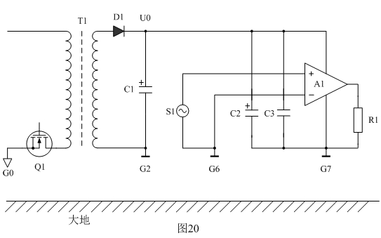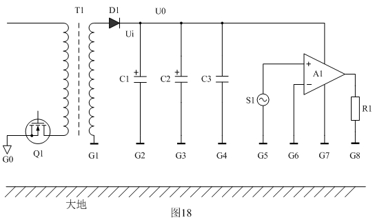 下面我們以圖18為例來分析地線對EMC產(chǎn)生的影響。圖18中Q1表示開關電源,T1為開關變壓器,D1為整流二極管,C1、C2、C3為濾波電容器,A1為功率放大器,S1為功率放大器輸入信號,R1為功率放大器輸出負載,G1、G2、G3、G4、G5、G6、G7、G8為各個器件的地;Ui表示整流輸出電壓,Uo表示經(jīng)過濾波后的輸出電壓。