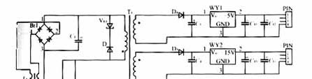 輸入為交流85~200V,經(jīng)功率二極管整流橋變?yōu)橹绷鳎鳛镈C/DC反激變換器的輸入,輸出為三組直流:5V、15V、20V,另外還有一輔助電源5V,用來給光耦NEC2501供電??刂齐娐窞榉答伩刂疲_關(guān)選用TOPSwitch電源芯片(TOP223)。TOPSwitch為三端離線式PWM電源集成控制器,它將PWM控制器與功率開關(guān)MOSFET合為一體,采用TO-220或8腳DIP封裝,除D、C2腳外,其余6腳連在一起作為S端。