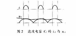 若線圈電感足夠大,則電流導(dǎo)通角可達(dá)到180°,電流近似正弦波,功率因數(shù)趨于1。但是,在實際應(yīng)用中,如果電感值太大,那么其體積重量隨之變大,從而影響了電源的小型化,而且整流電壓隨著負(fù)載變化較大,因此,線圈L也不能太大。本電路中共模扼流圈L2可起到電感的作用,其等效電感為L,則可抑制電容電流的高次諧波。
