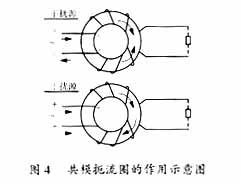 對開關(guān)電源二根進(jìn)線而言,存在共模干擾(二根線上受干擾信號相對參考點大小、方向相同)和差模干擾(二根線上受干擾信號相對參考點大小相等、方向相反)。共模扼流圈如圖4所示。