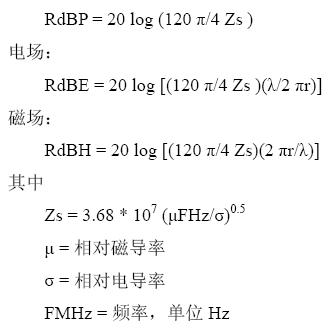 高阻抗源(電場)的波阻抗會大于120π 歐姆,而且它會隨著間隔距離的增大而逐漸減小,直到極限值。由此,有三個等式被用于計算屏蔽體表面的反射。這些等式假設(shè)Zw/Zs 或Zs/Zw >10。當(dāng)λ/2πr或2πr/λ=1 時,電場和磁場等式就變得和平面波的等式一致了。