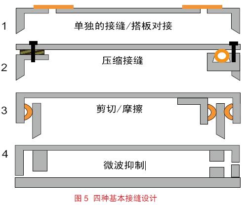 有四種不同構(gòu)造的接縫形式可供選擇,即(1) 單獨接縫,(2) 壓縮接縫,(3) 剪切或摩擦接縫,(4) 絕緣或阻塞抑制接縫。這些接縫的結(jié)構(gòu)如圖5 所示。最能夠代表單獨接縫的是搭板對接。示例中的頂部和底部接縫處于安裝在機架上的空白面板或活頁抽屜之間。因為沒有交疊,所以很難應(yīng)用傳統(tǒng)的襯墊材料。此時傾向使用的密封方法是在接縫處使用帶背襯粘合的導(dǎo)電薄片或織物帶。