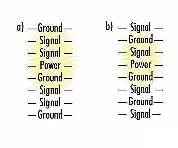 由於信號層和回路層之間總是隔有絕緣層,在10層板設(shè)計(jì)中分配中間6層來走信號線的方案并非最佳。另外,讓信號層與回路層相鄰很重要,即板布局為信號、地、信號、信號、電源、地、信號、信號、地、信號。