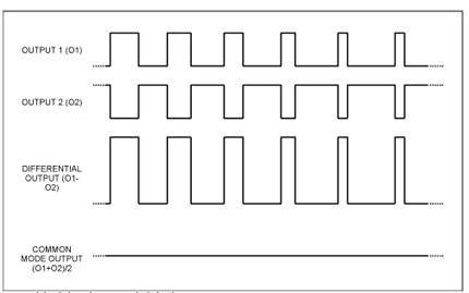 如圖1所示,如果器件的反相和同相輸出回路具有較高的匹配度,則兩個(gè)對(duì)稱輸出信號(hào)波形在揚(yáng)聲器或連線上將具有很小的共模(CM)信號(hào)(底部的跡線)。注意:50%占空比代表零輸入信號(hào)(空閑狀態(tài))。因此,可以設(shè)計(jì)一個(gè)差分低通濾波器,用于衰減信號(hào)波形中高頻分量(快速切換所產(chǎn)生的),同時(shí)保留有用的低頻分量以輸出到揚(yáng)聲器。