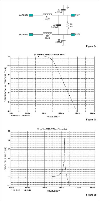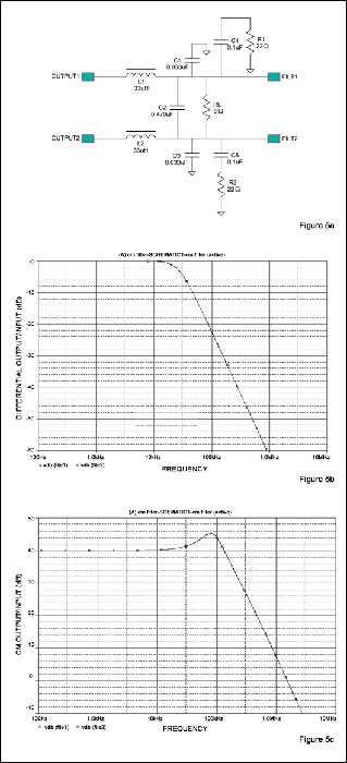 圖5.在傳統(tǒng)LC濾波器的每個(gè)輸出端增加一個(gè)RC網(wǎng)絡(luò)(a),可以改進(jìn)差分信號(hào)的頻響(b)和共模信號(hào)的頻響(c)。