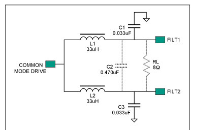 此類D類放大器對(duì)輸出濾波器的要求,不同于具有傳統(tǒng)差分輸入和互補(bǔ)PWM輸出的放大器。與PWM相比,MAX9704調(diào)制方案的輸出往往含有較高的共模信號(hào),設(shè)計(jì)輸出濾波器時(shí)需要考慮這點(diǎn)。正如后面的實(shí)例所示,傳統(tǒng)差分濾波器拓?fù)浣Y(jié)構(gòu)的效果往往不太理想。
