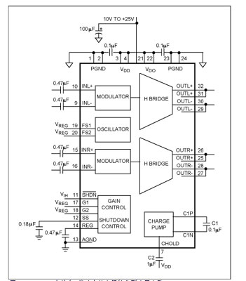 有些低開關(guān)頻率(200kHz至300kHz)應(yīng)用不適合采用圖5c所示的方案。對(duì)于這類產(chǎn)品可能需要采用其他方法和拓?fù)浣Y(jié)構(gòu)。MAX9704立體音D類放大器(圖6)可設(shè)置為940kHz固定頻率模式(FFM)(FS1=低,F(xiàn)S2=高),此時(shí)效果最佳。工作在FFM模式下的MAX9704通過引腳選擇將開關(guān)周期設(shè)為恒定值(具有三個(gè)可選項(xiàng)),以滿足應(yīng)用需求。