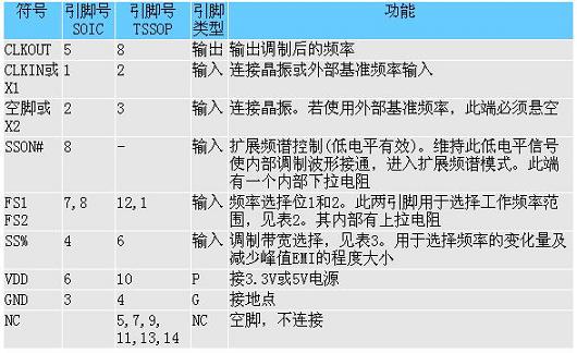 在擴展頻譜時鐘發(fā)生中,EMI減弱要依靠整形、調制率和調制波形的頻率。當整形及調制波形的頻率由已定的頻率來確定時,調制的百分比就會有所不同。使用頻率選擇位(FS1及FS2)能設置頻率范圍。擴展率也被設到-1.25%之間。見表2。高擴展率加強了對EMI的減弱,然而,高擴展率卻可能會因為超過系統(tǒng)最大額定頻率或低于平均頻率而使性能受到影響。鑒于上述原因,擴展率多在0.5%--2.5%之間。