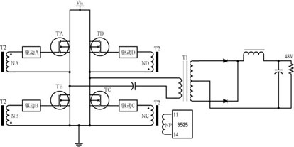 實際電路都是由非理想元件組成的,在設計中可能會遇到許多預料不到的情況。在調(diào)試如圖1所示的普通全橋電源時,輸出不是料想中平穩(wěn)的波形,而是不時發(fā)生間歇振蕩,并發(fā)出“吱吱”聲,有時甚至會燒毀開關管。對電路進行分析后未發(fā)現(xiàn)結構上可能導致不穩(wěn)定的因素,于是改變輸出采樣的電壓比,將輸出調(diào)定在半電壓24V上,使用90V的輸入直流電壓,在保證功率管安全的情況下進行調(diào)試。待電路工作正常后,再緩慢升高輸入直流電壓,經(jīng)過多次試驗,發(fā)現(xiàn)當Ui為180~250V時就可能引發(fā)振蕩,最后判定是驅動變壓器各個繞組之間的分布電容在搗亂。