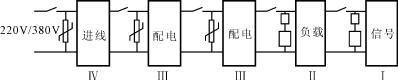 依據(jù)線路絕緣結(jié)構(gòu)理論及IEC61312、IEC664-1、IEC61643、GB50097-1994(2000年版)等標(biāo)準(zhǔn),對(duì)建筑物和電氣設(shè)備(如第三類防雷建筑物)進(jìn)行感應(yīng)過(guò)電壓防護(hù)的絕緣結(jié)構(gòu),如圖1所示。