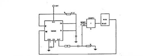 采用單穩(wěn)態(tài)觸發(fā)器NE555作為微機(jī)看門狗電路;當(dāng)系統(tǒng)工作正常時(shí),看門狗電路不起作用,當(dāng)系統(tǒng)運(yùn)行不正常時(shí),80C51的P1.1引腳不能給定時(shí)器送去觸發(fā)脈沖,這時(shí)NE555中單穩(wěn)態(tài)觸發(fā)器就輸出脈寬大于4US負(fù)脈沖,經(jīng)F6反相后加至80C51的復(fù)位端,使系統(tǒng)可靠的復(fù)位,這樣可防止因外界干擾引起的程序跑飛,使微機(jī)程序正常運(yùn)行,見圖1。
