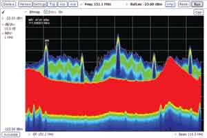 圖7 使用DPX在5s后發(fā)現(xiàn)的偶發(fā)瞬態(tài)信號。紅色區(qū)域是頻繁發(fā)生的信號,藍(lán)色部分和綠色部分是瞬態(tài)信號