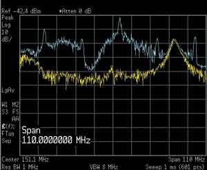 幸運的是,測量技術(shù)的發(fā)展已經(jīng)可以滿足這些需求。上面介紹了如何使用實時頻譜分析儀發(fā)現(xiàn)瞬態(tài)信號和EMI隱患。在下面的實例中,單個的瞬態(tài)信號會產(chǎn)生一串瞬態(tài)信號,這些信號每次只持續(xù)很短的時間。在本例中,該設(shè)備是一種嵌入式系統(tǒng),在把數(shù)據(jù)緩存到硬盤時導(dǎo)致了瞬態(tài)EMI.在使用掃頻分析儀的峰值檢波器簡單檢查后(黃色軌跡,如圖6所示),似乎只有一個連續(xù)信號;把儀器保持Max-hold幾分鐘,同時循環(huán)DUT工作模式,會指明問題(藍(lán)色軌跡)。但在峰值檢波模式下進行快速掃描會得到黃色軌跡,沒有檢測到問題。